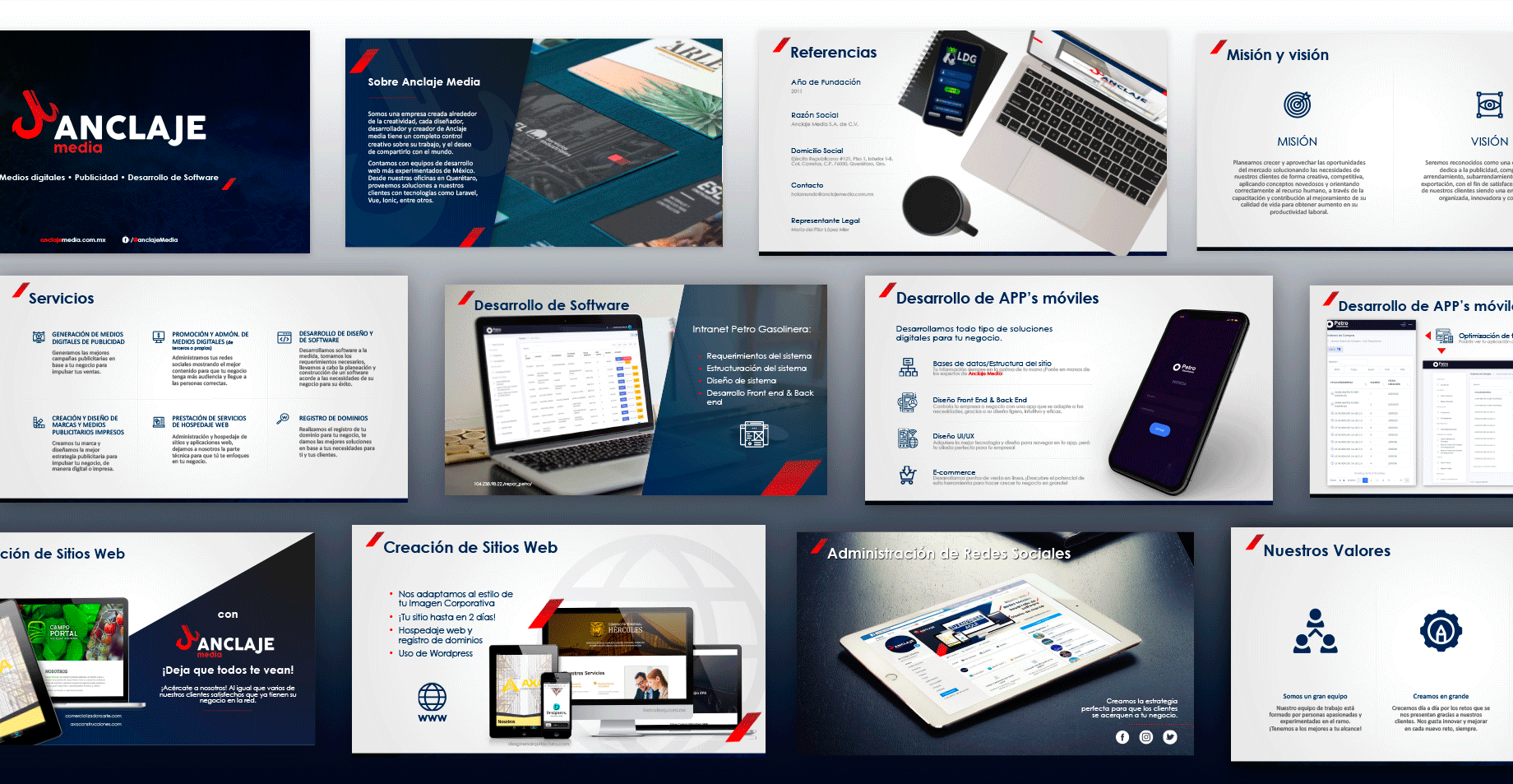 En Anclaje Media trabajé en proyectos de alto volumen y con tiempos muy ajustados, principalmente diseñando sitios web corporativos para un mismo cliente. En muchos casos, la única información disponible era documentación legal, como actas constitutivas, por lo que el reto fue convertir contenido técnico y poco estructurado en sitios claros, funcionales y visualmente coherentes.