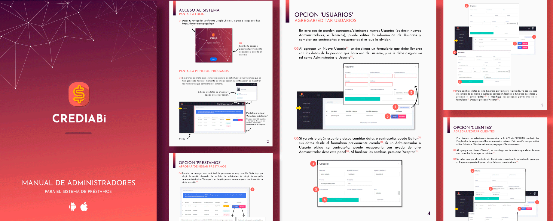 Además del diseño de interfaces, desarrollé materiales editoriales para el proyecto, entre ellos un brochure de ventas dirigido a clientes y un manual de usuario para administradores del sistema en el backend de la aplicación.