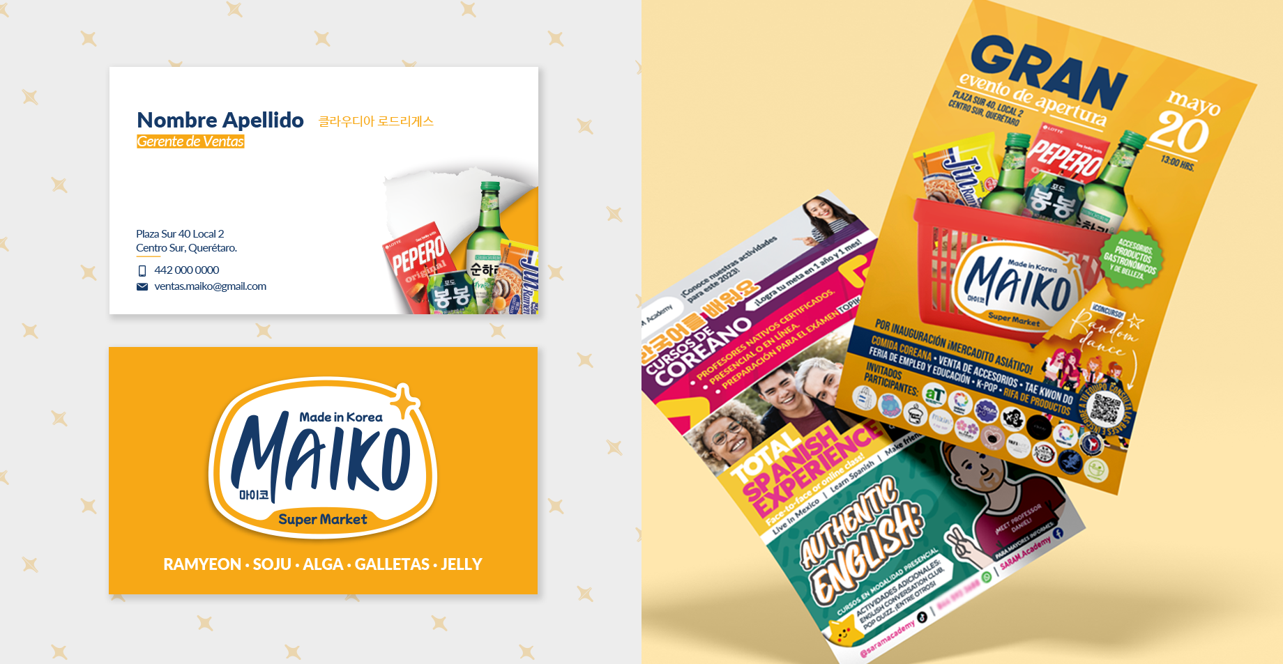 En 2023 participé en la apertura de MAIKO Mini Super Coreano en Querétaro, colaborando principalmente en el área creativa y de comunicación visual. Diseñé el logotipo de la tienda, desarrollé viniles y microperforados para decorar vidrio y paredes, y gestioné la colocación de un anuncio luminoso.