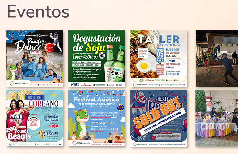 Estos eventos normalmente tenían temáticas de cultura coreana y servían principalmente para promocionar la Academia, pero en algunas otras ocasiones se realizaron eventos para recaudar dinero extra, como fiesta secreta de ramen, en la que solo se admitía a estudiantes, tutores y acompañantes, también ayudé a organizar algunos mercaditos o bazares de temática orental o coreana en el que se invitaba a vendedores locales a rentar espacio para vender productos dentro de la Academia, y talleres de cocina coreana, esto funcionó tan bien, que actualmente otras escuelas copiaron las actividades para promocionarse.